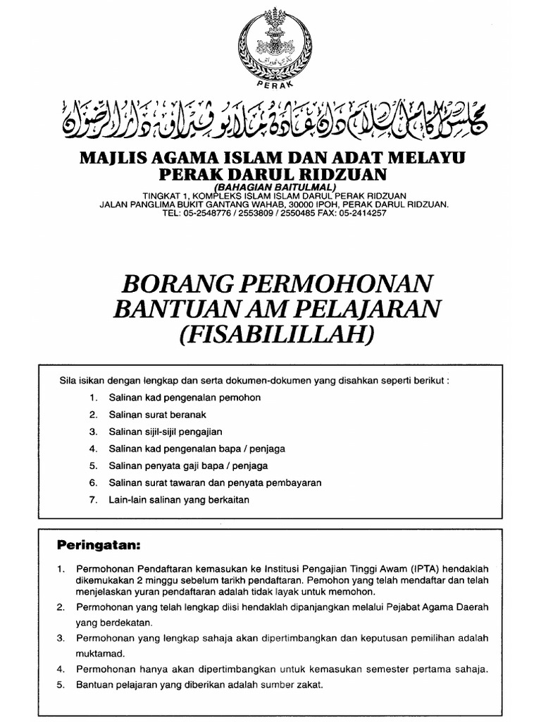 Web CARA PERMOHONAN BANTUAN ZAKAT PERAK. Web Anda disarankan untuk menggunakan pelayar Mozilla Firefox bagi mengakses sistem ini. Majlis Agama Islam dan Adat Melayu Perak MAIAMP membuka permohonan Skim Biasiswa Pelajaran Baitulmal kepada para pelajar tingkatan.